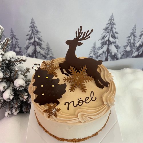 当店大人気のチョコレートケーキ。チョコシフォン生地に贅沢なチョコがナッシュをサンド。チョコレートクリームでコーティングしたケーキの上には、クリスマスツリーとトナカイが走ります!甘さ控えめの食べやすいケーキはお子様からご年配まで好評です。